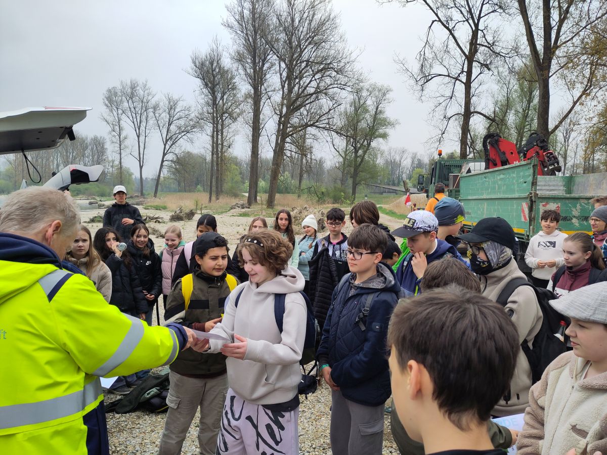 Nach einem knapp einstündigen Fußmarsch wurde die Schülergruppe in Begleitung der Umweltbeauftragten Anita Goller und der Lehrerin Margit Radlinger-Rauch von Clemens Berger vom Wasserwirtschaftsamt (WWA) Deggendorf begrüßt. Clemens Berger hatte noch einige Mitarbeiterinnen und Mitarbeiter zur Verstärkung dabei und auch das Haus zur Isarmündung war personell vertreten, um ihr Wissen an die 33 Fünft- bis Achtklässler weiterzugeben.