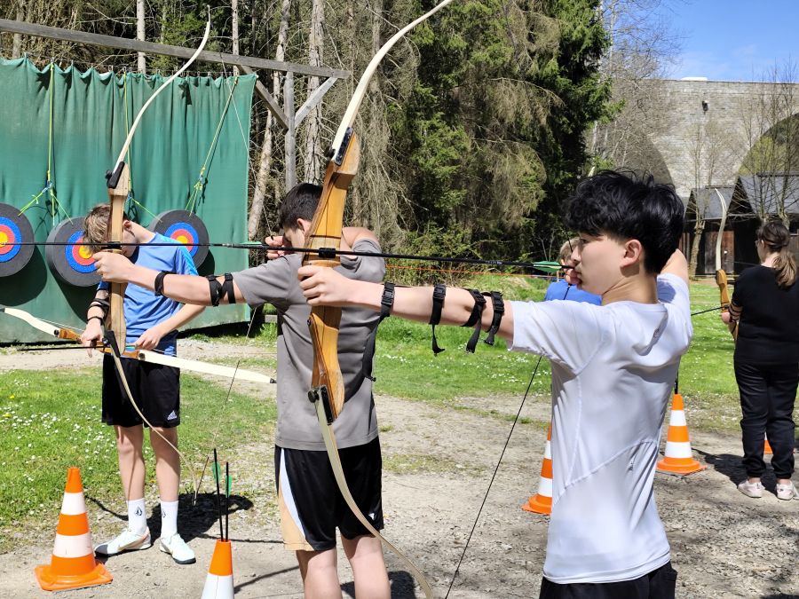 In den folgenden Tagen standen für die Schüler zahlreiche sportliche Aktivitäten auf dem Programm. Bei schönem Wetter konnten sich die Schülerinnen und Schüler beim Klettern, Bogenschießen und Biathlon ausprobieren. Dabei ging es nicht nur um sportliche Leistungen, sondern auch um gegenseitige Unterstützung, das Überwinden eigener Grenzen und vor allem um Spaß an der Bewegung. Dabei wurden sie von den begleitenden Lehrkräften Frau Hain-Küpper, Frau Bock, Herrn Sager, Herrn Denk und Frau Reimer immer angefeuert und motiviert.