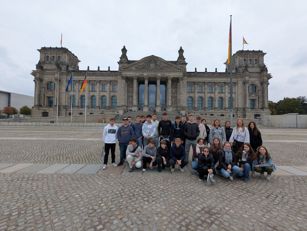 Bereits bei der Hinfahrt konnten im Deutsch-deutschen Museum in Mödlareuth erste Eindrücke gesammelt werden, wie die innerdeutsche Grenze zwei politische Systeme und damit Menschen voneinander trennte. Eine Wunde, die bis in die heutige Zeit ihre Spuren hinterlassen hat. Und nachdem „Klein-Berlin“ erkundet war, machte man sich auf ins große Berlin und auch dort stieß man immer wieder auf Spuren der einstmals getrennten Stadt. Eine Stadtrundfahrt brachte die Schülerinnen und Schüler zu wechselnden Orten und so wurde eine Brücke über 200 Jahre Berliner Geschichte geschlagen. Noch größere Zeiträume deckte die Erkundung des Berliner Naturkundemuseums ab – nichts weiter als der Anbeginn des Universums oder die Evolution in all ihrer Pracht wurde den wissbegierigen Augen geboten: Ob T-Rex oder nur der kleine Verwandte Archaeopteryx, ob bleicher Fisch oder farbenprächtiger Papagei. Die Gegenwart wurde nicht ausgeblendet und so folgten die Klassen der Einladung von MdB Marlene Schönberger und erkundeten das Herz der Demokratie: den Bundestag im Reichstag.