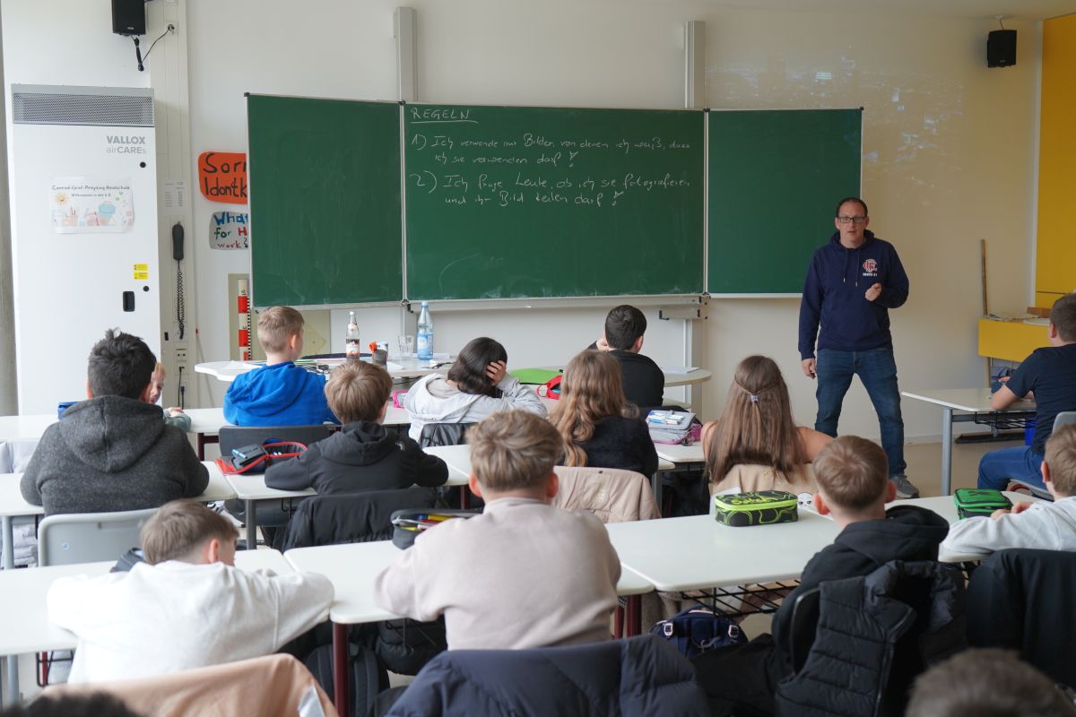 Im Anschluss kündigte Herr Fischer an, mit seinem Smartphone Fotos der Klassen für die Polizei-Homepage machen zu wollen. Sofort drehten sich einige Kinder von der Kamera weg, und der Begriff „Datenschutz“ fiel mehrfach. Zu Recht, denn Bilder dürfen nur nach vorheriger Zustimmung aufgenommen und weitergegeben werden – eine Regel, die insbesondere auch für Klassenchats von großer Bedeutung ist.