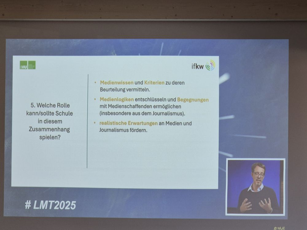 Im zweiten Teil der Veranstaltung appellierte Professor Carsten Reinemann von der LMU München an ein menschliches Grundvertrauen gegenüber etablierten Medien. Man könne und solle kritisch sein, jedoch sei Vertrauen eine wichtige Brücke zwischen Information und Wissen. Die Schule habe dabei enorm große Bedeutung für junge Menschen.