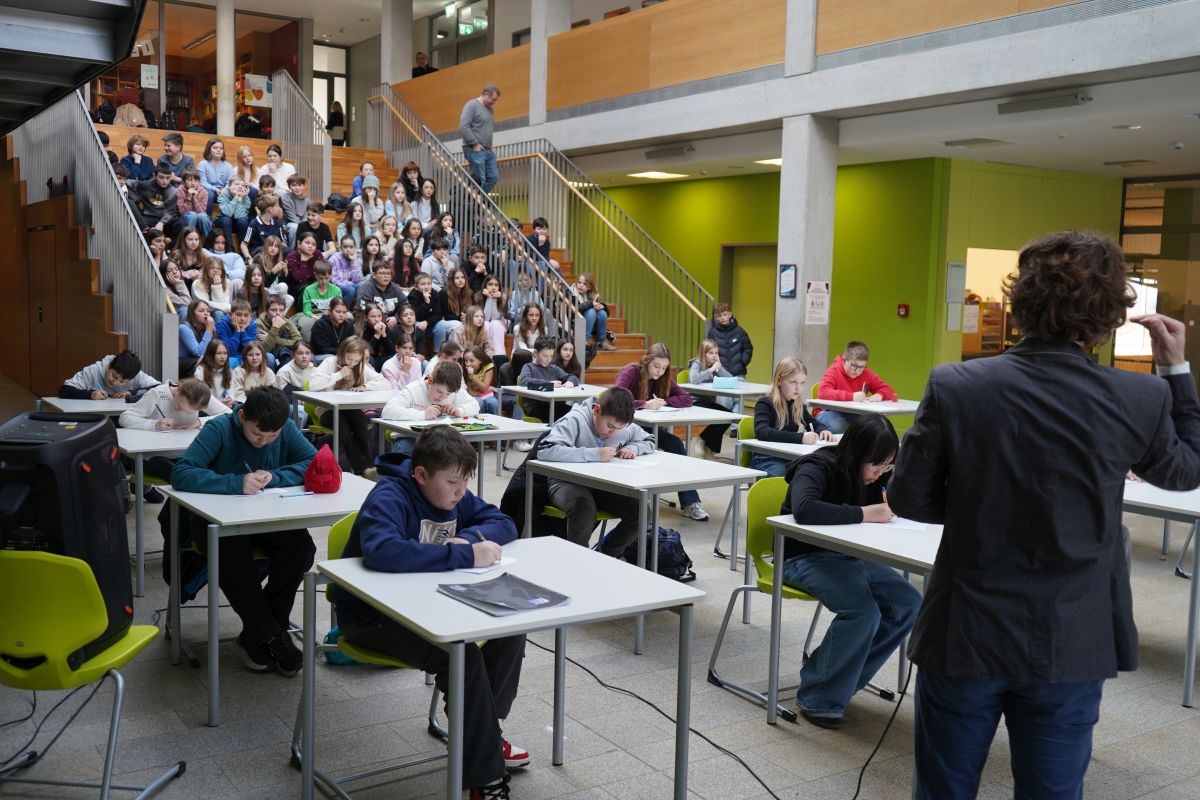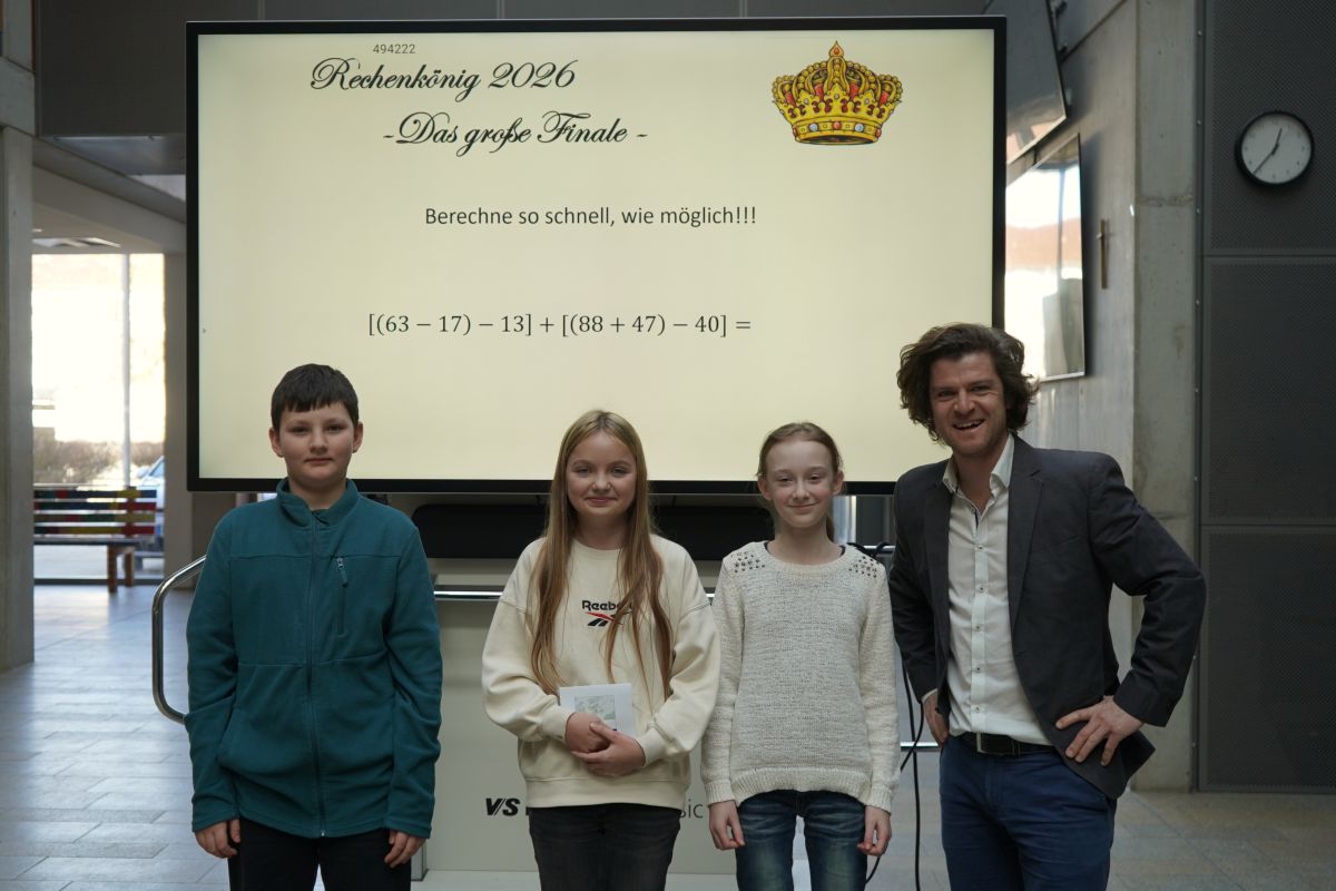 Die Fünftklässler mussten sich in den vergangenen Wochen bereits im Klassenverband in einem Vorentscheid gegen ihre Mitschülerinnen und Mitschüler beweisen und durchsetzen. Für das große Finale am 10.02.2026 qualifizierten sich also nur die vier besten Rechnerinnen und Rechner aus jeder fünften Klasse. Am Finaltag selbst durften alle Teilnehmerinnen und Teilnehmer in der Aula der Schule als Publikum die Matheshow verfolgen.