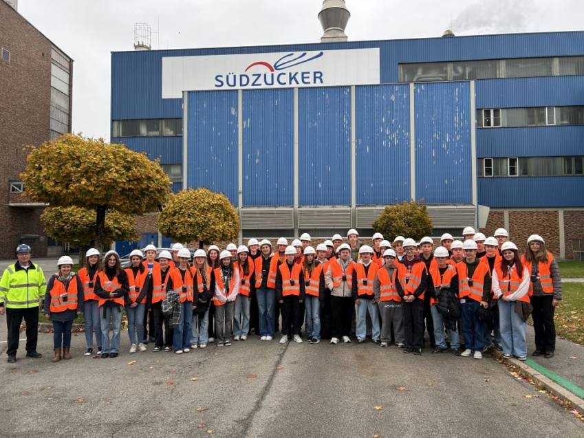 Die Schülerinnen und Schüler der Klassen 9a und 9b machten sich im Rahmen des Chemie-Unterrichts mit ihren Lehrerinnen Frau Hilgartner und Frau Bock auf den Weg zur Südzucker-Fabrik in Plattling und erhielten dort einen Einblick in die heimische Zuckerproduktion.