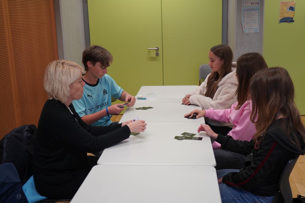 In einem strategischen Spiel hatten die Jugendlichen die Aufgabe, gemeinsam ein Problem zu lösen. Jeder erhielt einen Teil der Regeln auf Karten, die nur durch Zusammenarbeit zur Lösung führten. Entscheidend war, dass die Karten weder gezeigt noch Notizen gemacht werden durften – die Lösung konnte nur durch Vorlesen, Zuhören, gezieltes Nachfragen, Absprachen und koordiniertes Handeln erreicht werden.
