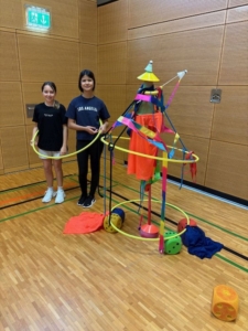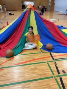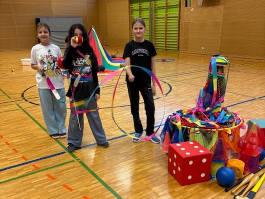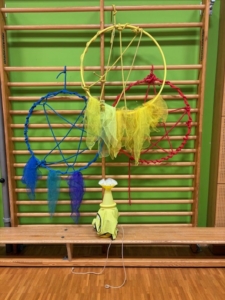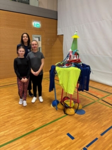 Zu festlichen Klängen gestalteten sie ihre persönlichen Weihnachtsgrüße. Dabei wurde der Geräteraum beinahe komplett geleert und das Inventar anschließend umfunktioniert. So entstanden aus Tüchern, Hütchen, Trikots, Reifen, Seilen und Bällen ganz kreative Weihnachtsobjekte.